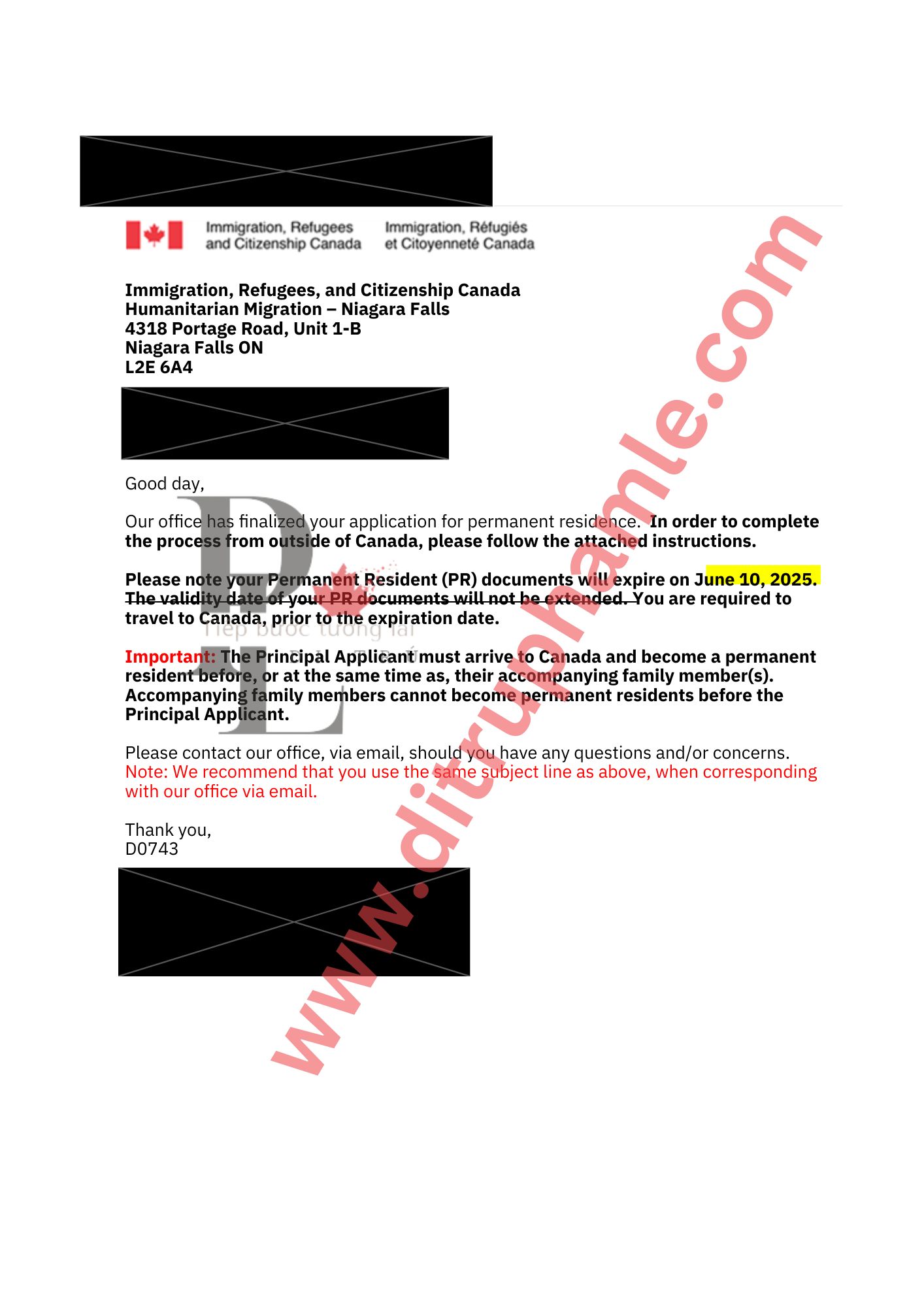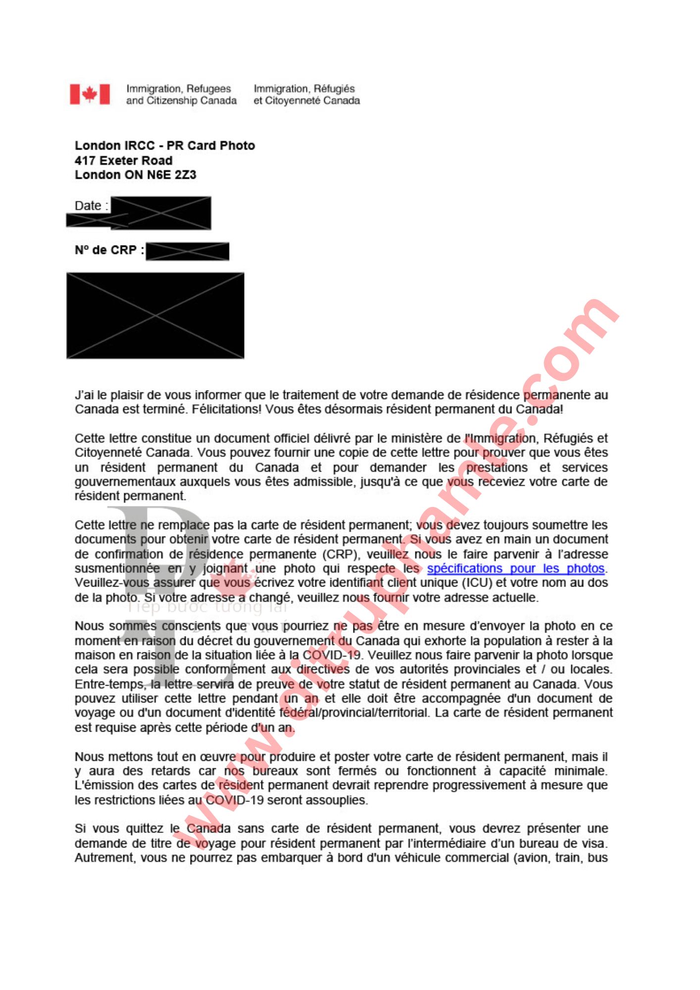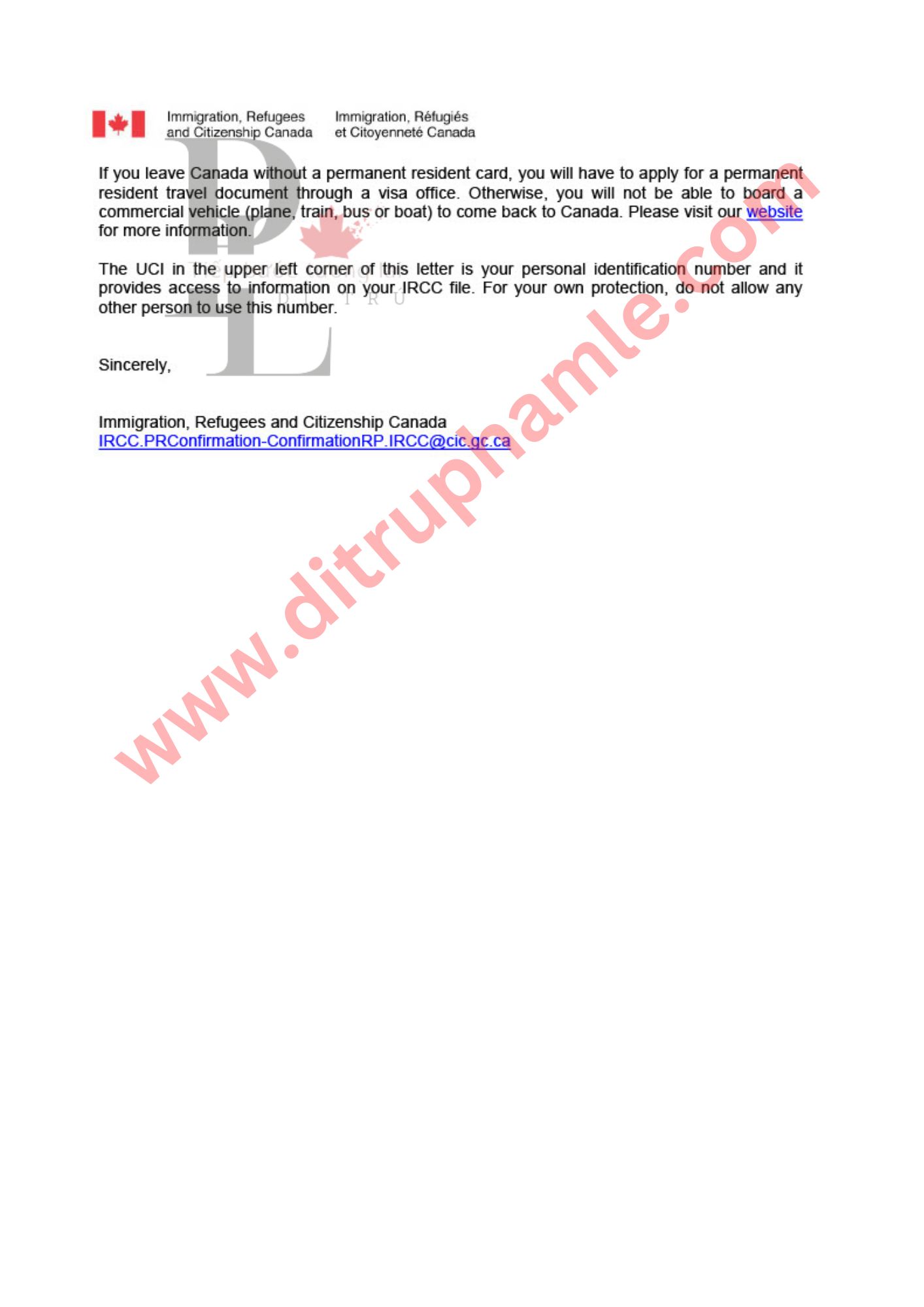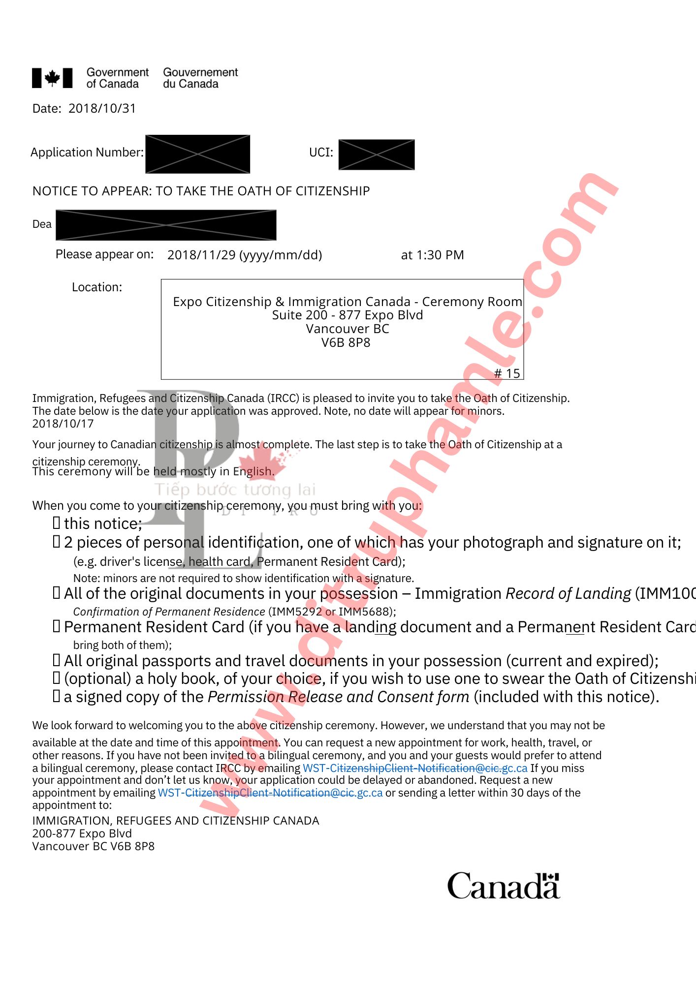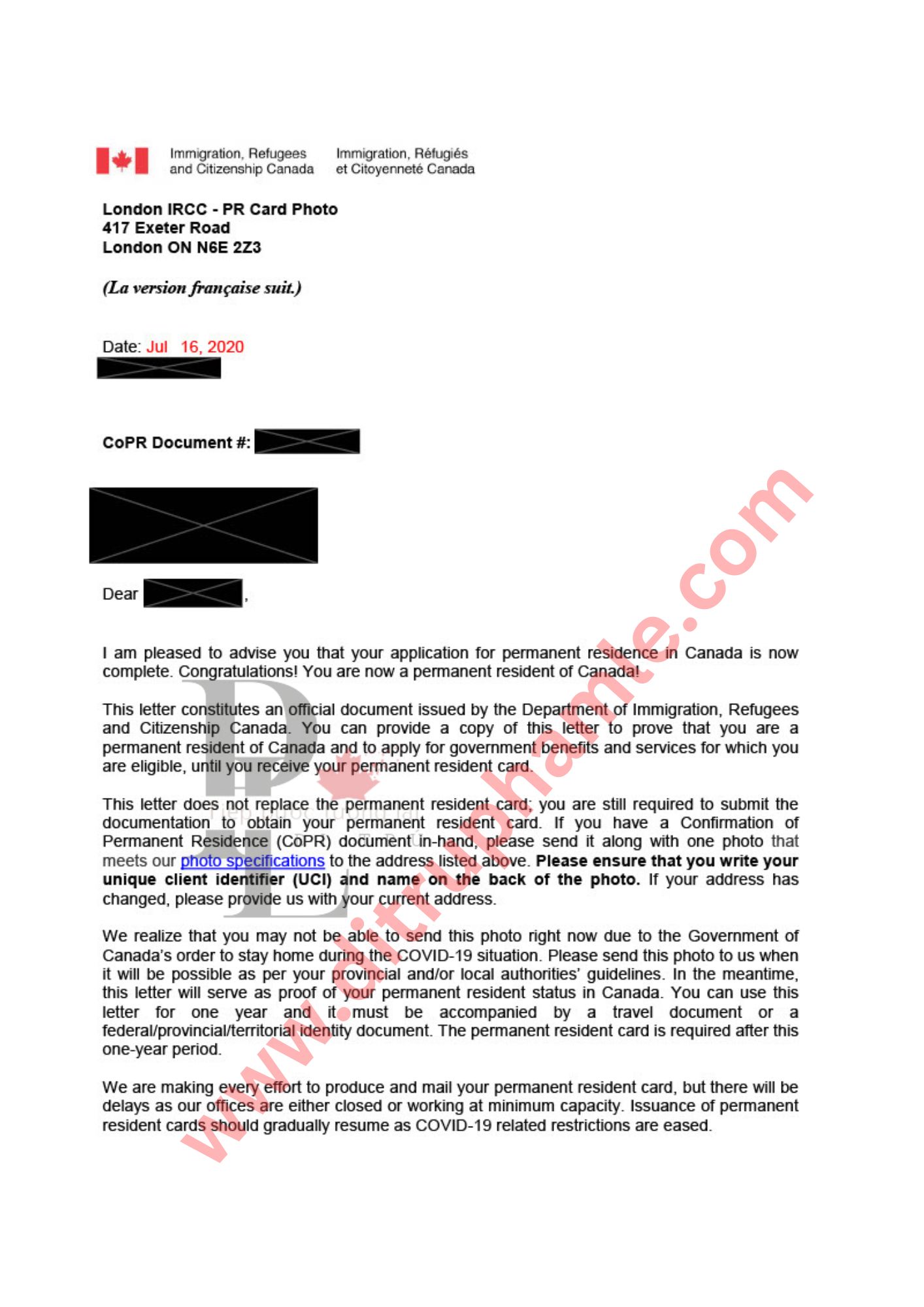 Thư mời khách hàng đến Canada để hoàn tất thủ tục cấp thẻ PR cho khách hàng thực hiện nộp đơn xin PR ngoài Canada
