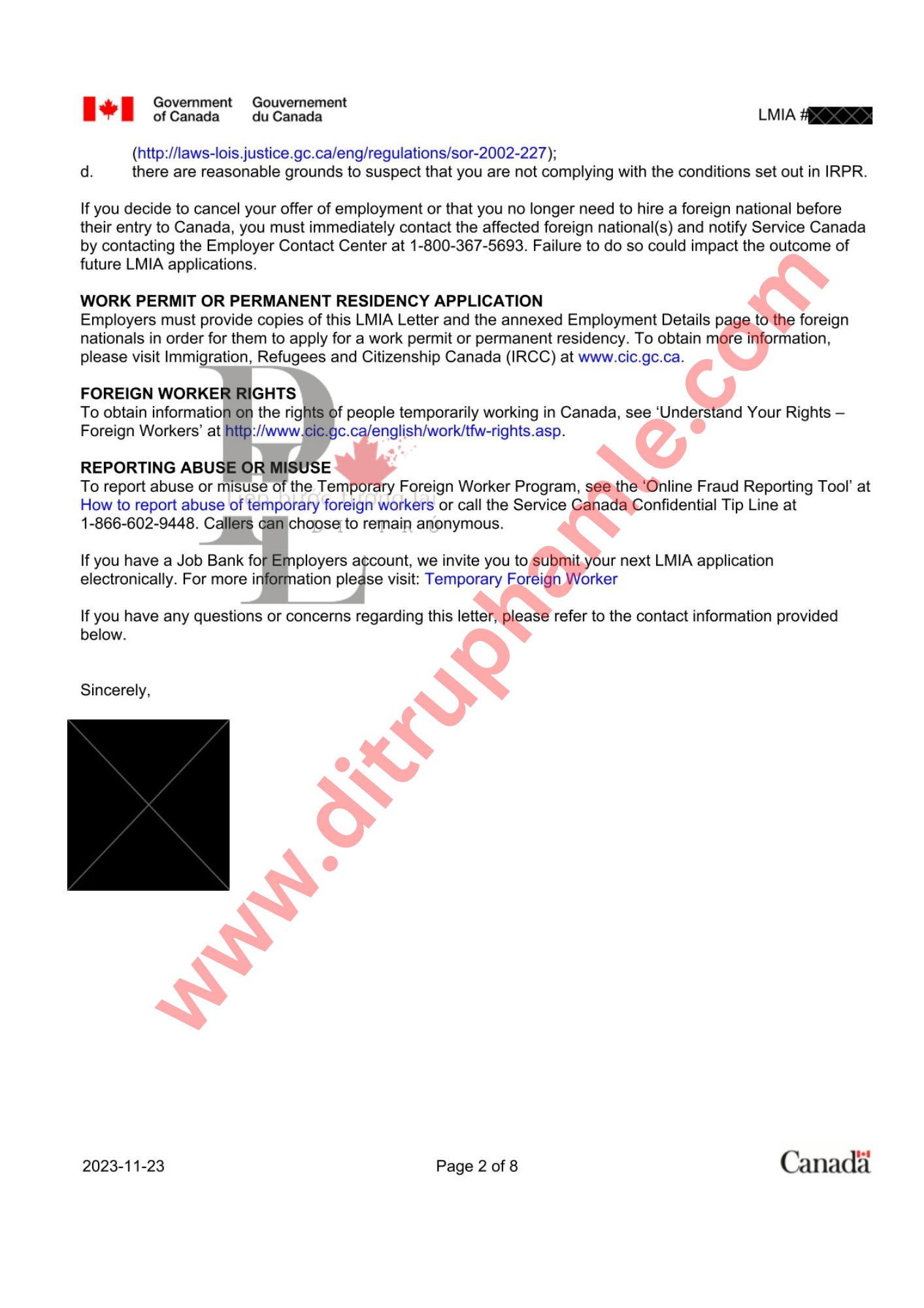 Thư thông báo phê duyệt cho phép tuyển dụng lao động nước ngoài của doanh nghiệp (LMIA) – trang 2