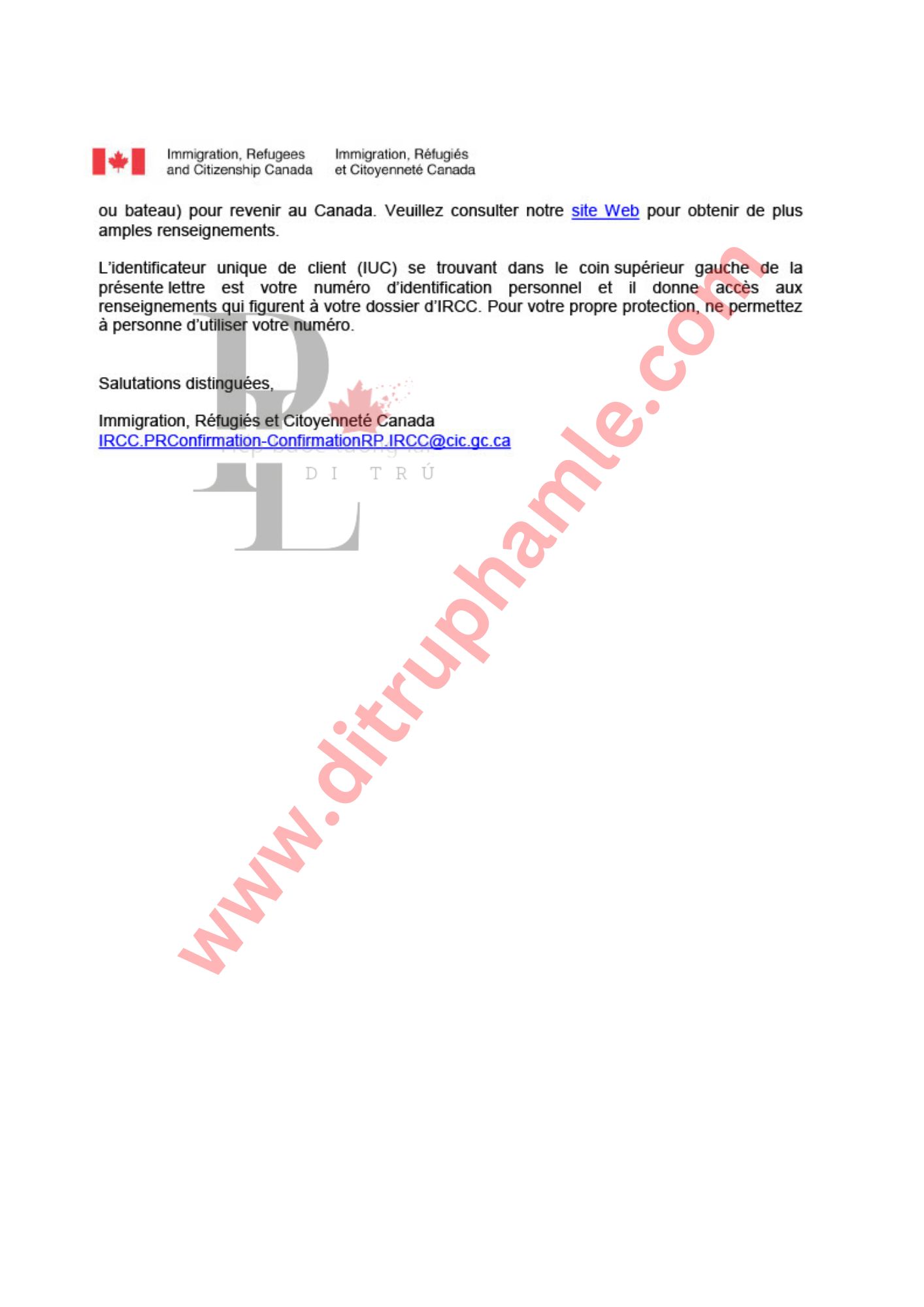 Thư thành công – thông báo khách hàng thành công nhận được quyền thường trú nhân PR tại Canada – trang 2