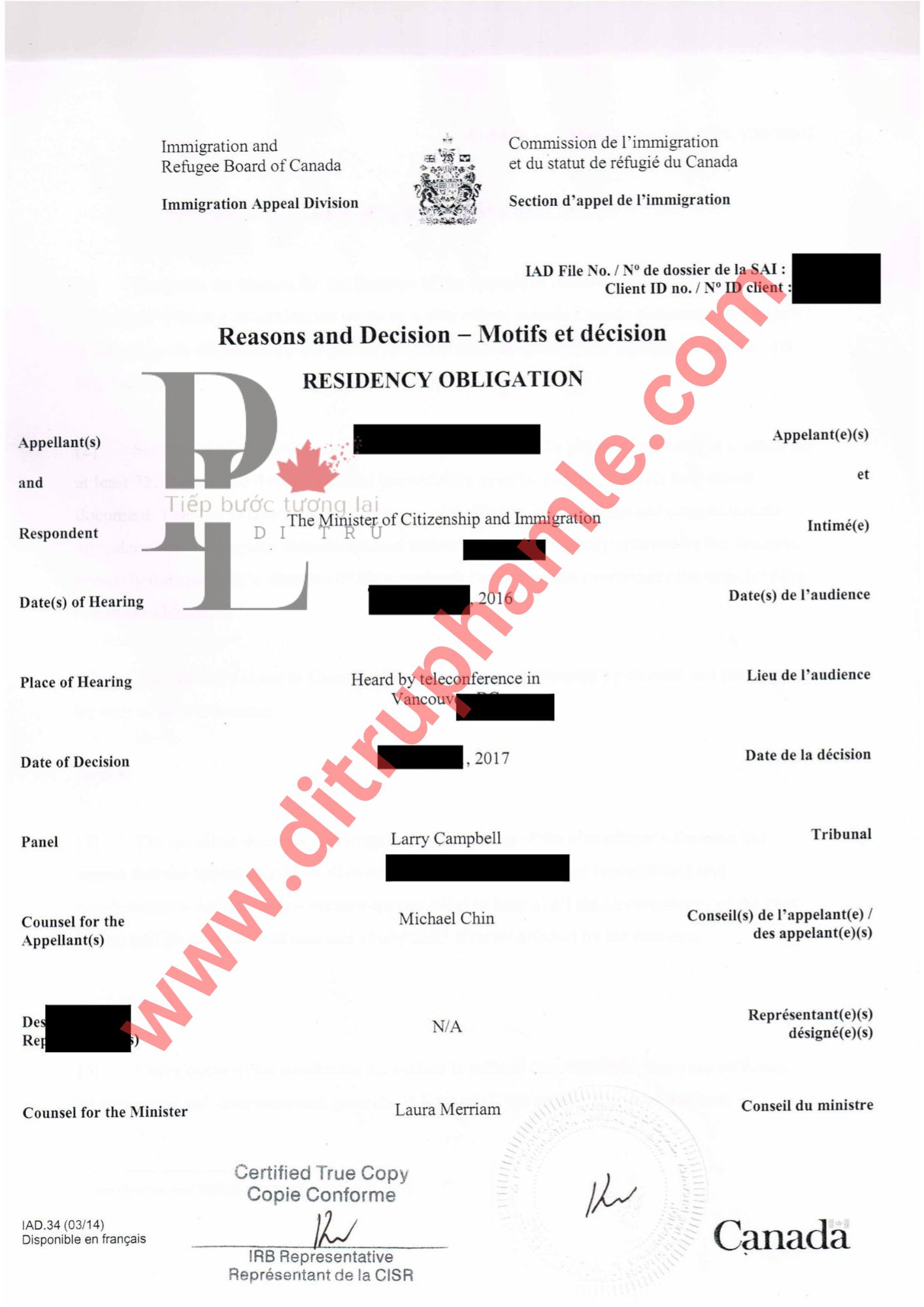 Thư thành công – thông báo khách hàng thành công nhận được quyền thường trú nhân PR tại Canada – trang 1