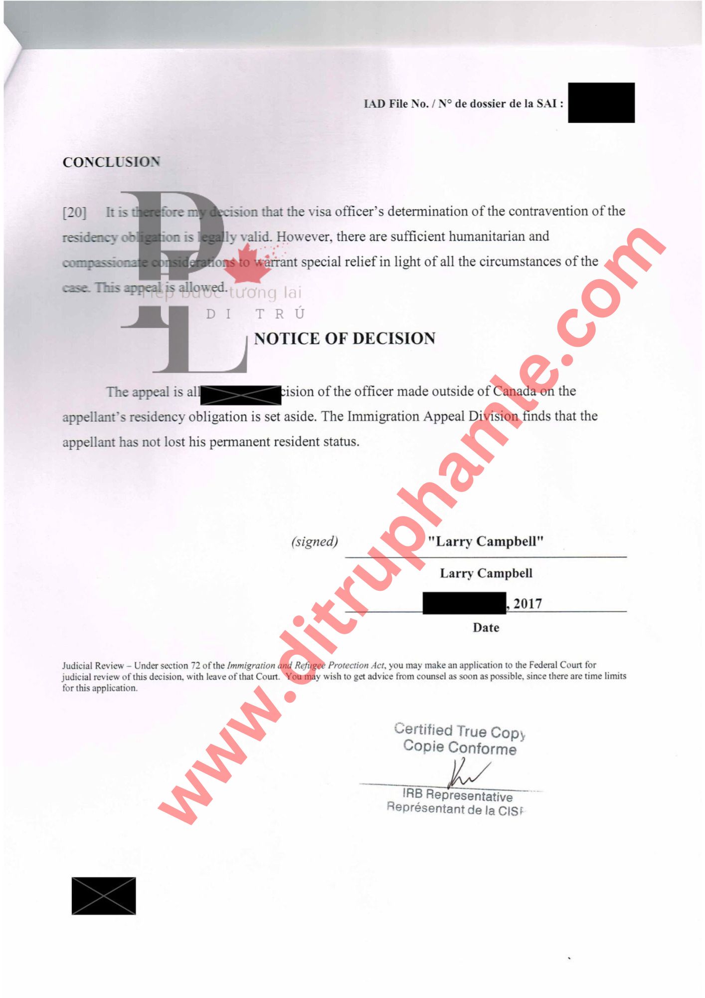 Thư thành công – thông báo khách hàng thành công nhận được quyền thường trú nhân PR tại Canada – trang 2